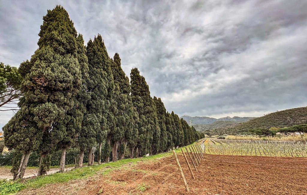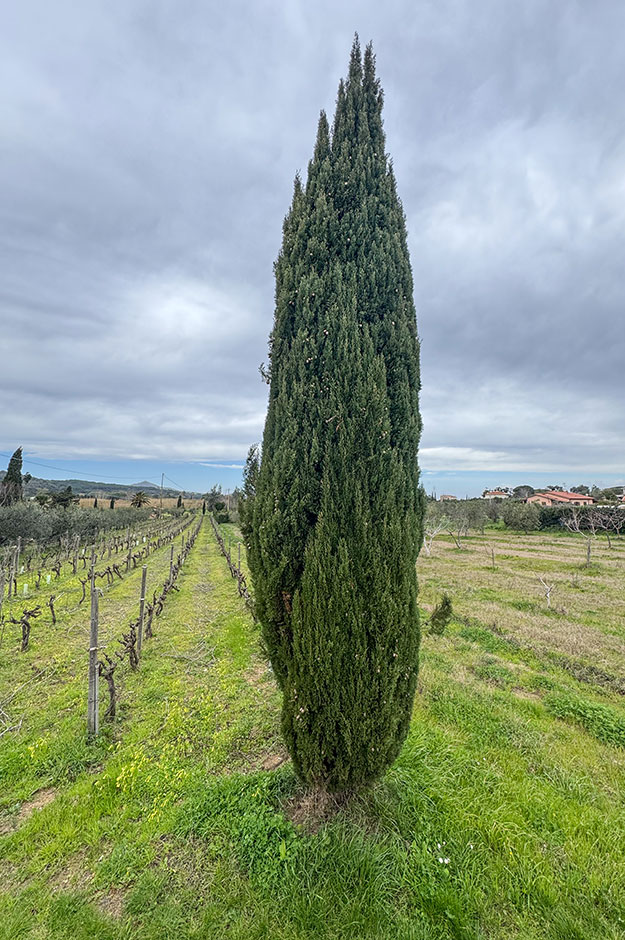 Conifera particolarmente longeva, a rapido accrescimento, alto fino a 30 metri. Originario del mediterraneo orientale, il cipresso è stato portato in Italia dagli Etruschi o addirittura dai Fenici. Si ritrova spontaneo o coltivato soprattutto in Toscana continentale dove, assieme all’olivo, determina l’aspetto del paesaggio. La chioma può essere affusolata e piramidale oppure disordinata e tendenzialmente globiforme nel caso della varietà horizontalis, detta cipresso femmina. Da sempre usato per barriere frangivento. Il legno, duro e compatto, inattaccabile dagli insetti, ha un odore persistente e gradevole, ed è molto ricercato per la costruzione di mobili e infissi. Una malattia legata al fungo Seiridium cardinale provoca fessurazione della corteccia e disseccamento con gravi ripercussioni sulla specie e lacerazioni nel paesaggio. Dal cipresso si ottengono preparazioni impiegate nell’industria farmaceutica e in profumeria. Risulta naturalizzato all’Elba solo nella valle del Monserrato, altrove si trova solitamente all’interno di proprietà, giardini, lato strada e cimiteri. La fama funeraria del cipresso inizia con i poeti greci e romani e le sue radici, scendendo a fuso in profondità invece che svilupparsi in orizzontale, non interferiscono con le sepolture.