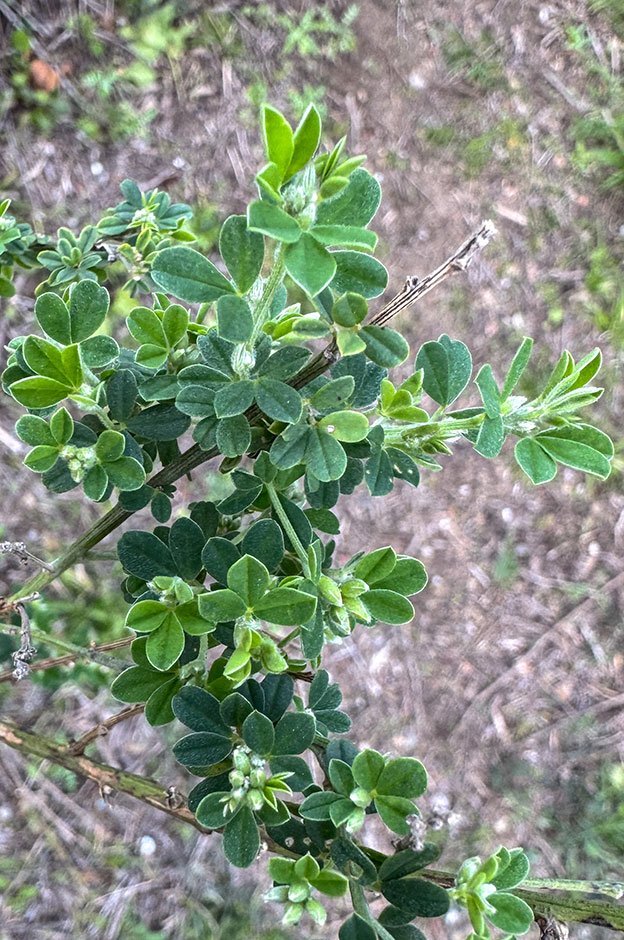 Il citiso di Montpellier è una pianta cespugliosa con portamento eretto, alta fra mezzo metro e poco più di 2 metri. Cresce ai margini delle leccete e della macchia. I rami sono striati, quelli giovani sono pubescenti, le foglie sono trifogliate e picciolate. Le infiorescenze sono in corimbi brevi composti da 4-8 fiori. Il legume è pubescente. La pianta è comune sul versante tirrenico, meno su quello adriatico. Questo citiso in Italia pur essendo esuberante non ha modalità invasive di occupazione del territorio mentre è diventato un problema in diversi paesi dove è stato introdotto. In Gran Bretagna risulta presente già nel 1735 come pianta coltivata. Giunta come pianta da giardino si è poi inselvatichita e anche grazie alla generosa produzione di semi (10.000 a stagione) e alla capacità di rigermogliare dopo taglio e incendi. La pianta esercita una vigorosa azione invasiva in determinati habitat dell’Australia (600.000 ettari), della costa occidentale degli Stati Uniti e in altri paesi dove forma campi densi in cui le altre specie sono sopraffatte. Fra le azioni positive della pianta: fissa l’azoto e aumenta la fertilità del terreno. In Sardegna sono noti alcuni limitati utilizzi come rimedio della medicina tradizionale.