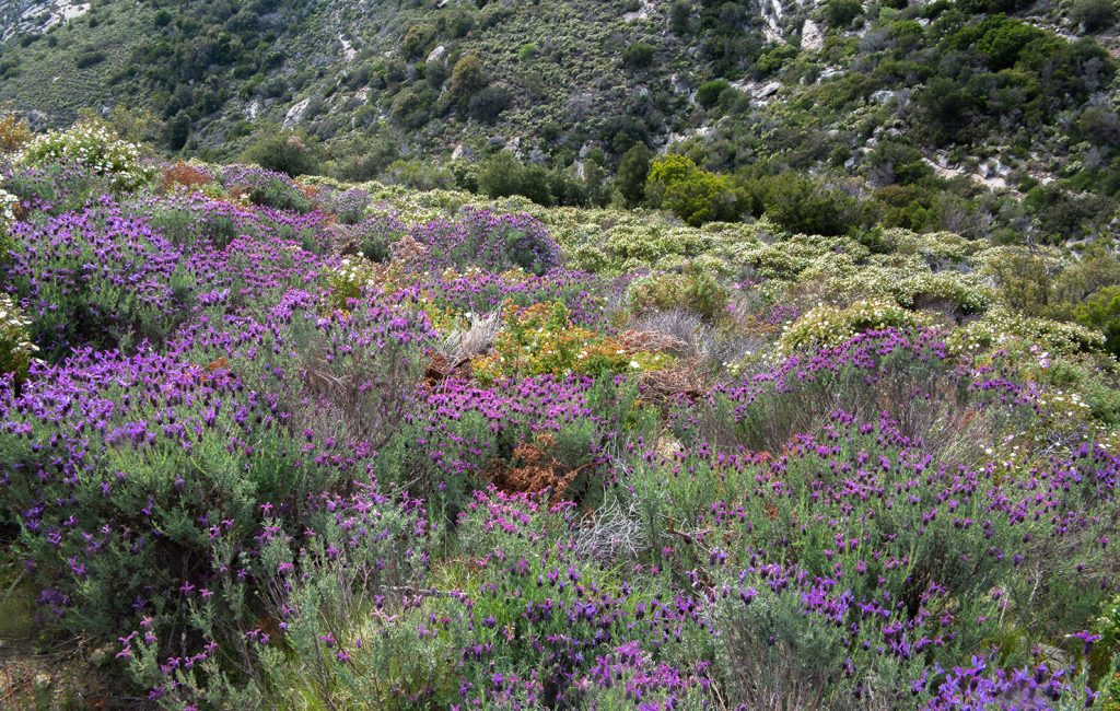 La lavanda è ricca di oli essenziali che emanano un forte odore aromatico. Si tratta di un arbusto cespuglioso, legnoso e sempreverde. Le foglie sono molto aromatiche di colore verde grigio chiaro. I fiori di colore viola-porpora sono riuniti in spighe particolarmente belle e vistose. La lavanda selvatica è parte delle piante che caratterizzano la gariga mediterranea ma la si può notare anche fra le fessure di rocce in verticale. Si ritiene che il nome lavanda derivi dalla consuetudine antica di aggiungere questa pianta all’acqua di lavaggio. La lavanda è nota da oltre 2500 anni come rimedio naturale, per profumare e nella mummificazione. La si trova citata nel De Materia Medica di Dioscoride (65 d.C.). Ha diversi utilizzi medicinali. In alcune parti d’Italia le estese fioriture permettono la raccolta di grandi quantità di miele di lavanda. Nel linguaggio dei fiori la visione e il ricordo delle piante del genere Lavandula “dona serenità e felicità”.