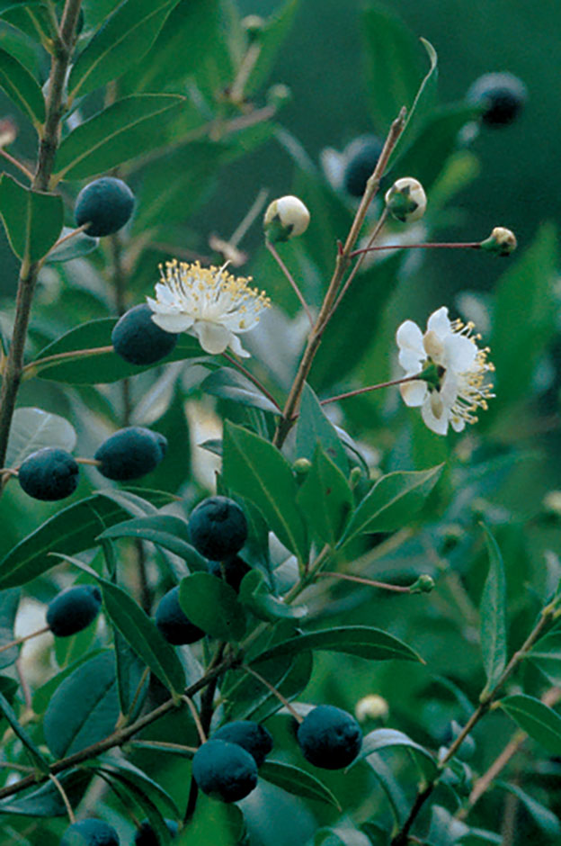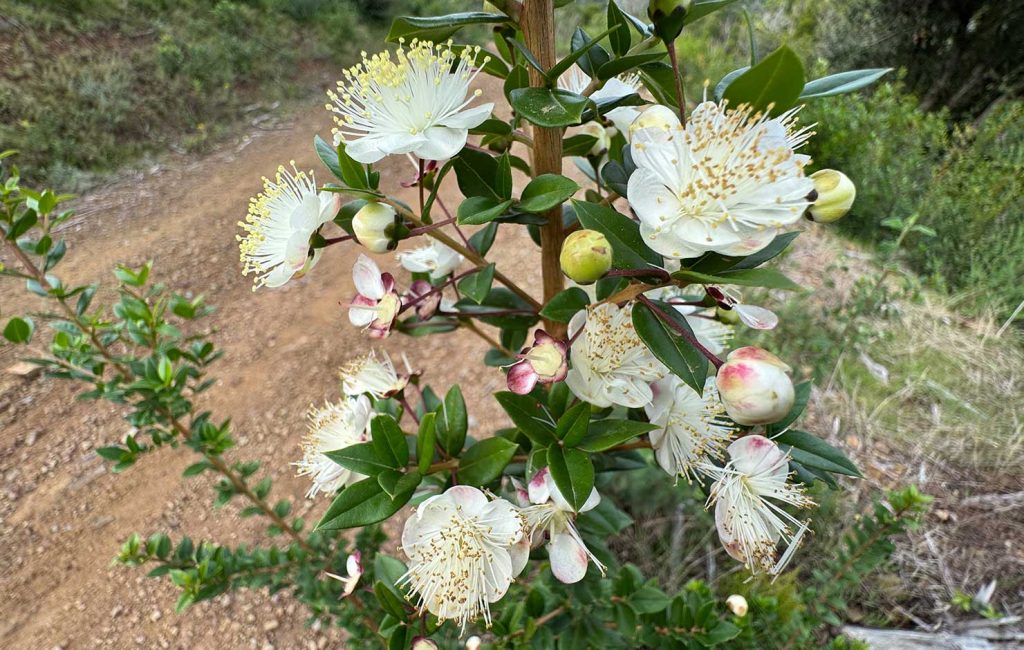 Nella mitologia il mirto è la pianta simbolo delle vittorie ottenute senza spargimento di sangue, delle divinità femminili come Ishtar, Artemide, Turan e Afrodite, della fecondità e dell’eros (il “myrtus coniugalis” di Plinio), ma soprattutto delle donne combattenti, di amazzoni come Myrsìne, Mirìne e Myrtò e della profetessa Myrtìla. Questo arbusto sempreverde dal profumo aromatico e resinoso e dalla chioma densa ha cinto teste famose. Le foglie hanno l’apice acuto ma non pungente; la loro lucentezza è un carattere adattativo finalizzato a deviare parte dei raggi solari, riducendo così i danni da insolazione. Le foglie se toccate emettono un gradevole odore simile a quello dell’arancia per la presenza di mirtenolo. I fiori sono solitari e hanno un profumo intenso. In tardo autunno, quando sulla pianta ci sono già le bacche, può prodursi una seconda fioritura e allora sui suoi rami saranno compresenti fiori e frutti (come nella foto). I frutti si utilizzano per aromatizzare alcuni alimenti e per fare il liquore di mirto. La pianta contiene olii essenziali, sostanze aromatiche e altre sostanze fitoterapiche impiegate per trattare diversi disturbi; viene inoltre utilizzata in profumeria, nella preparazione di saponi e cosmetici. I rami più giovani venivano impiegati nell’isola per intrecciare ceste.